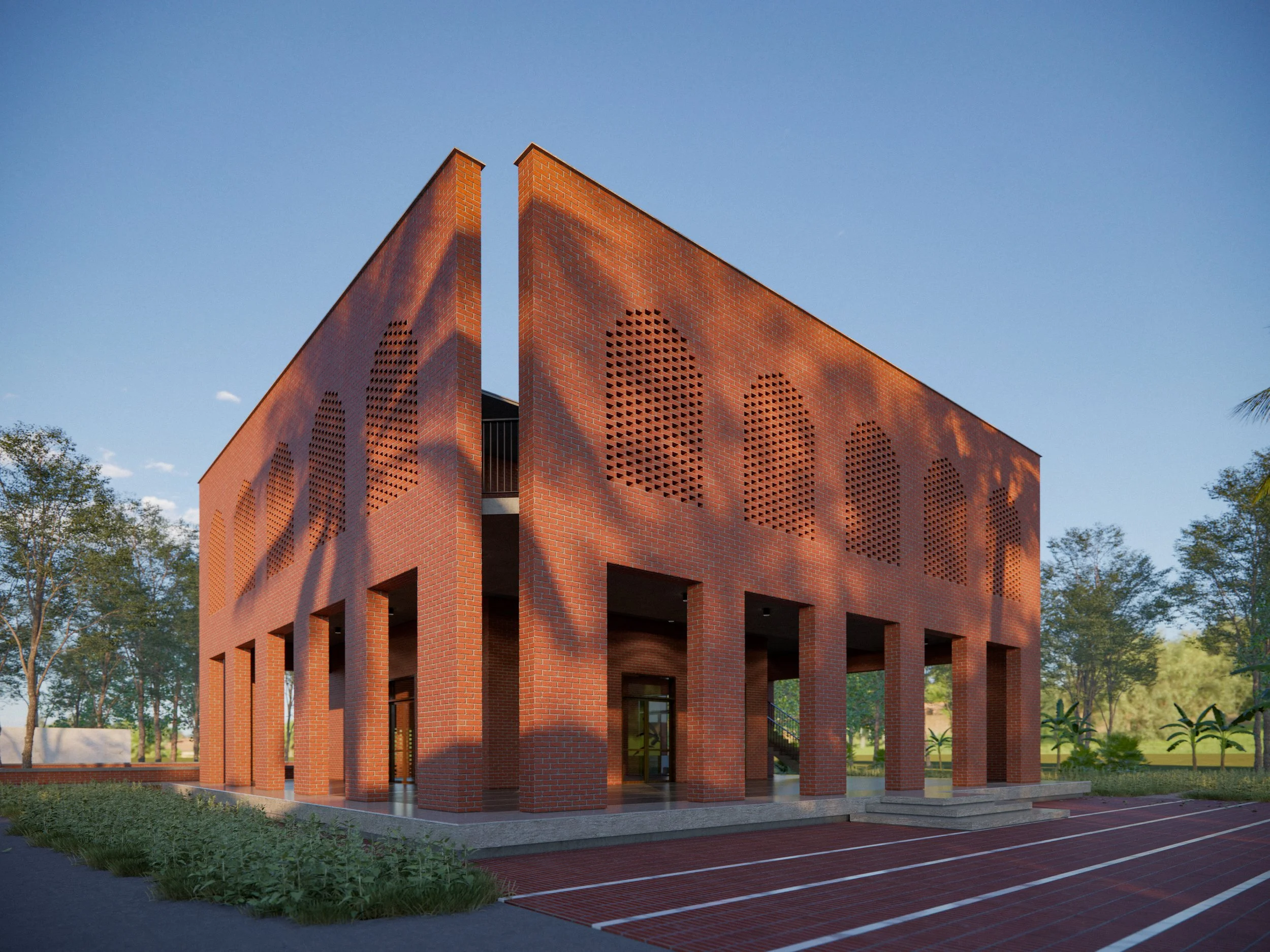 A humble village mosque designed in reference to the morphology of traditional mughal bengali mosques. It incorporates the use of strict geometries, archways and mashrabias.