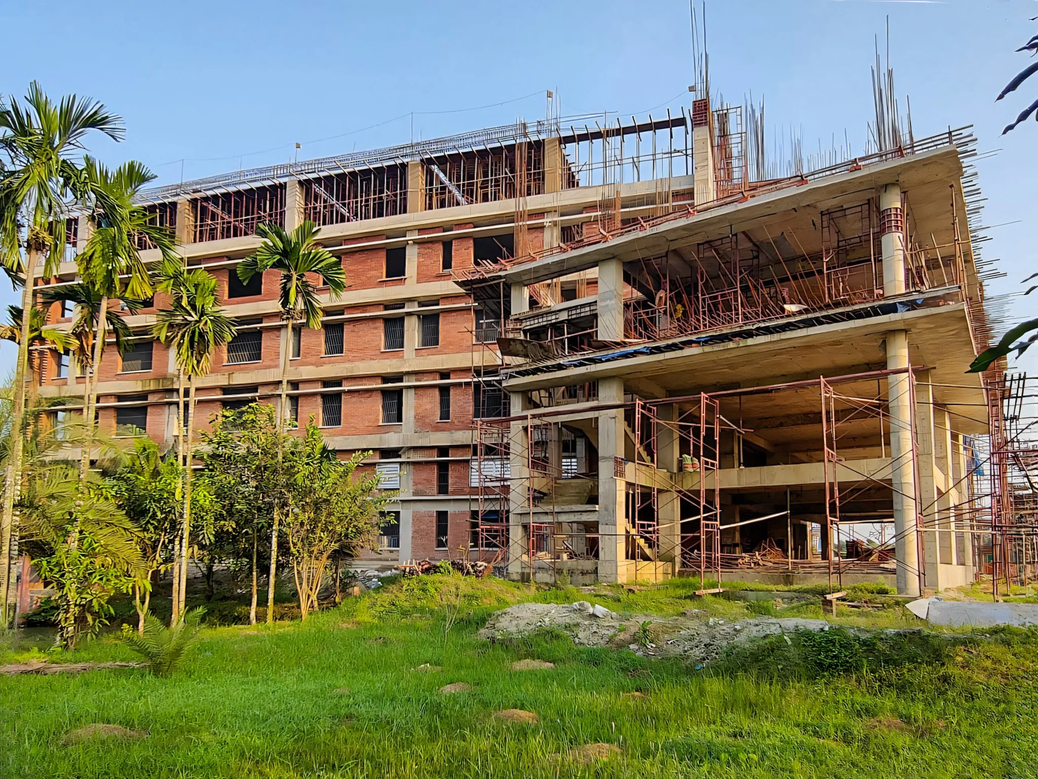 The site of the ecotrims indusctrial park is beautiful - having a large pond and numous existing trees. The revised masterplan proposed by our team largely preserved that existing landscape and water body and a very compact and programetically dense building is prepared with both adminstration and production combined as an intersection of two masses. Deep shading provides protection from the sun and the rain.