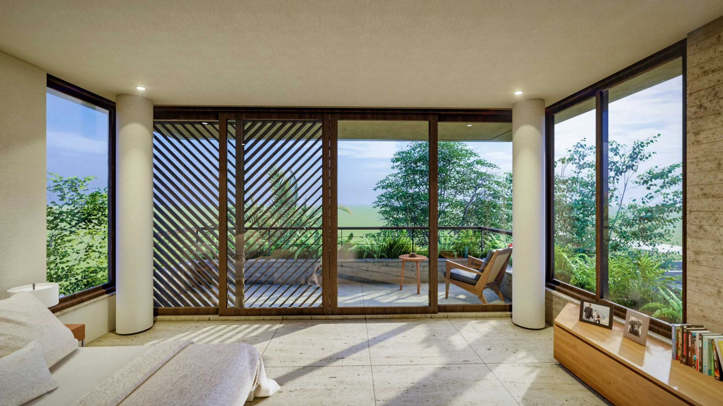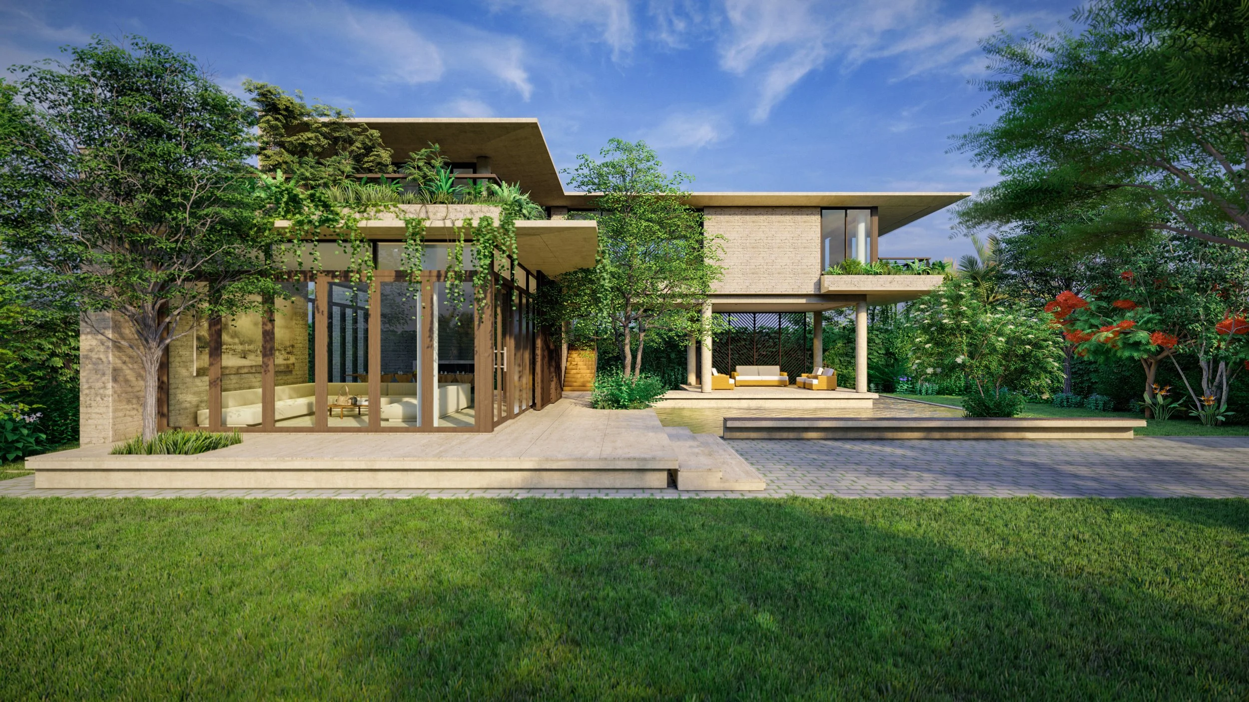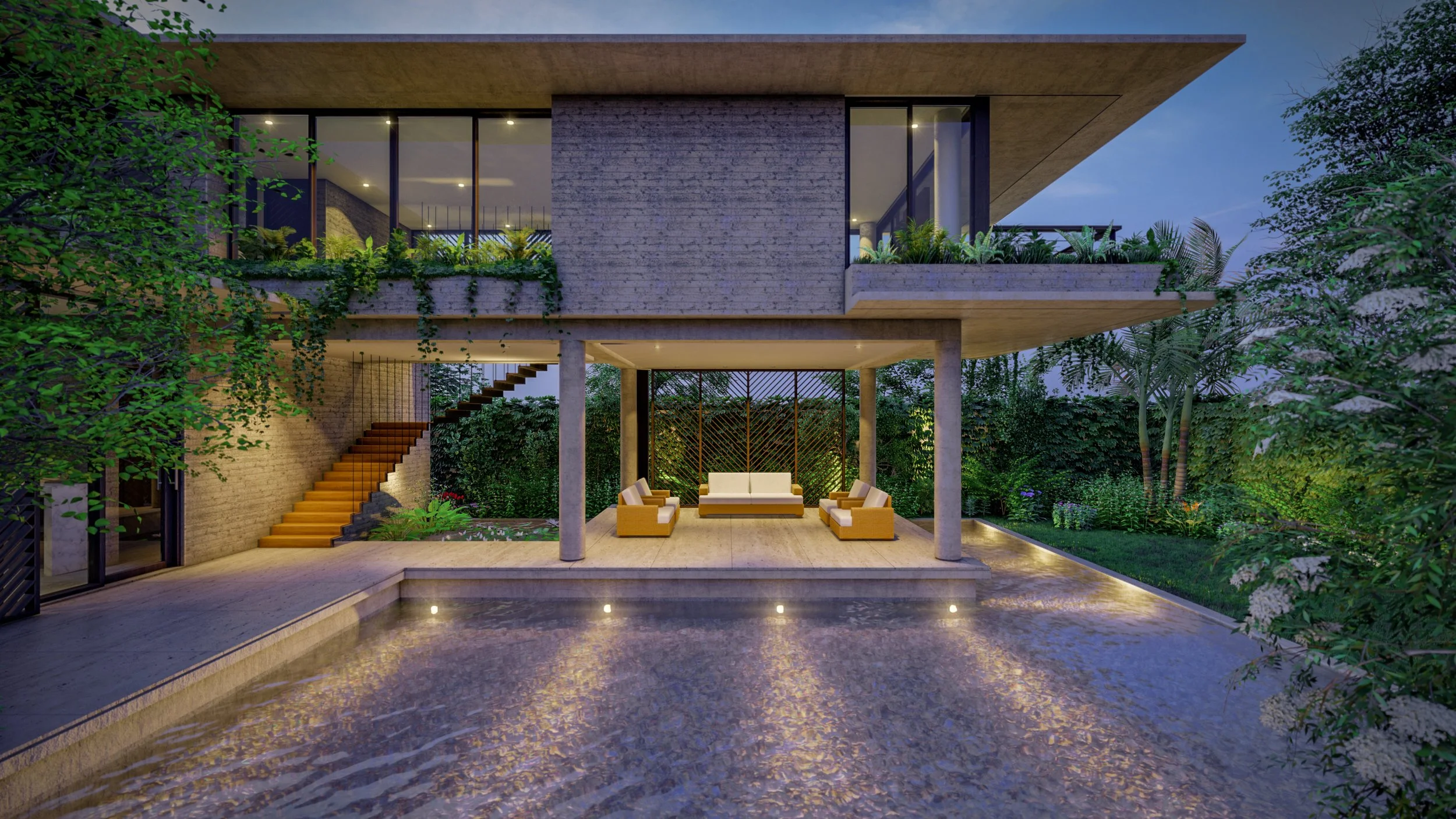 This unbuilt project aimed to provide a unique spatial experience in a compact but natural setting. The living spaces opens up like a pavilion yet maintains privacy and cross ventilation for the bedrooms. A diagonal screen cuts the western sun.