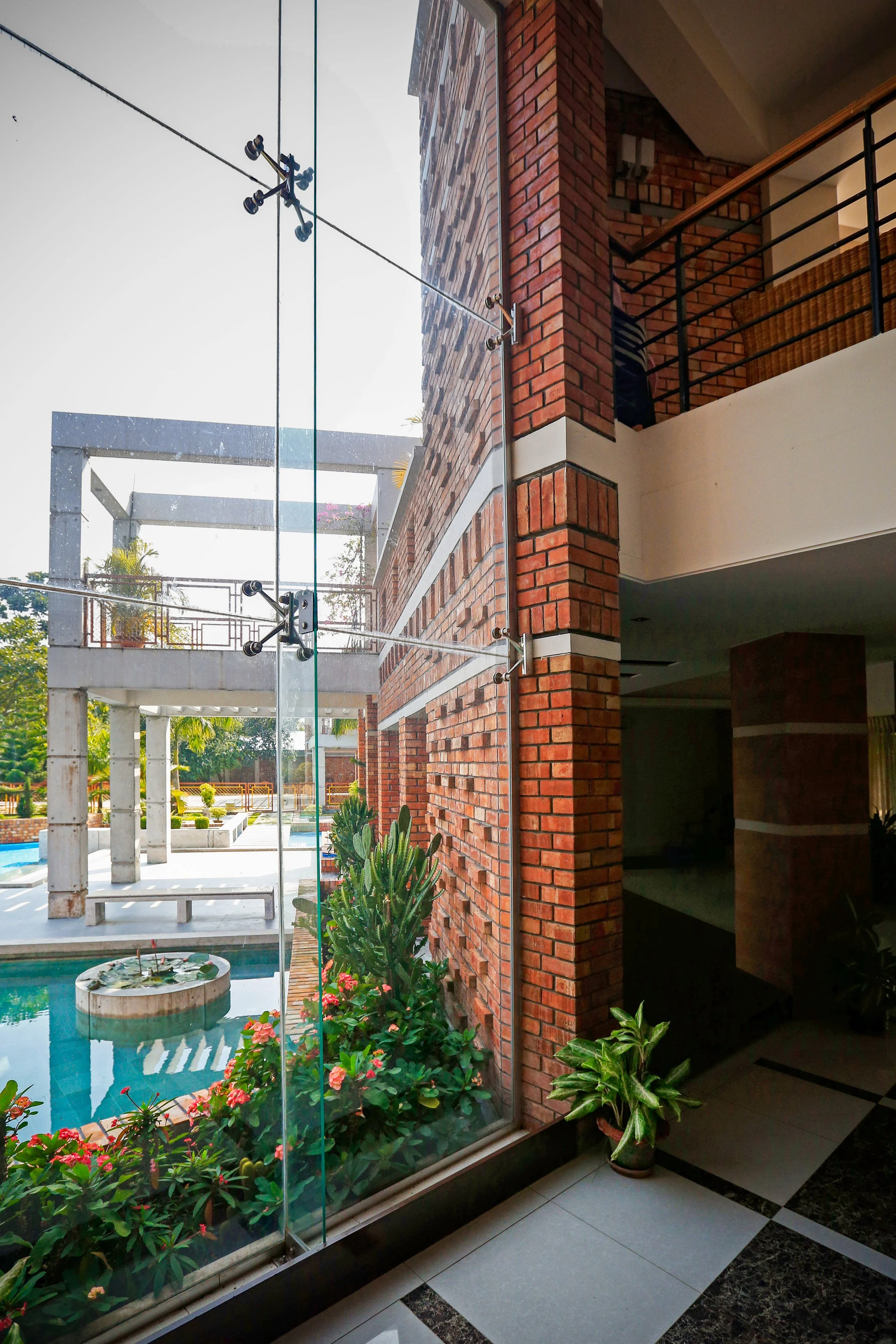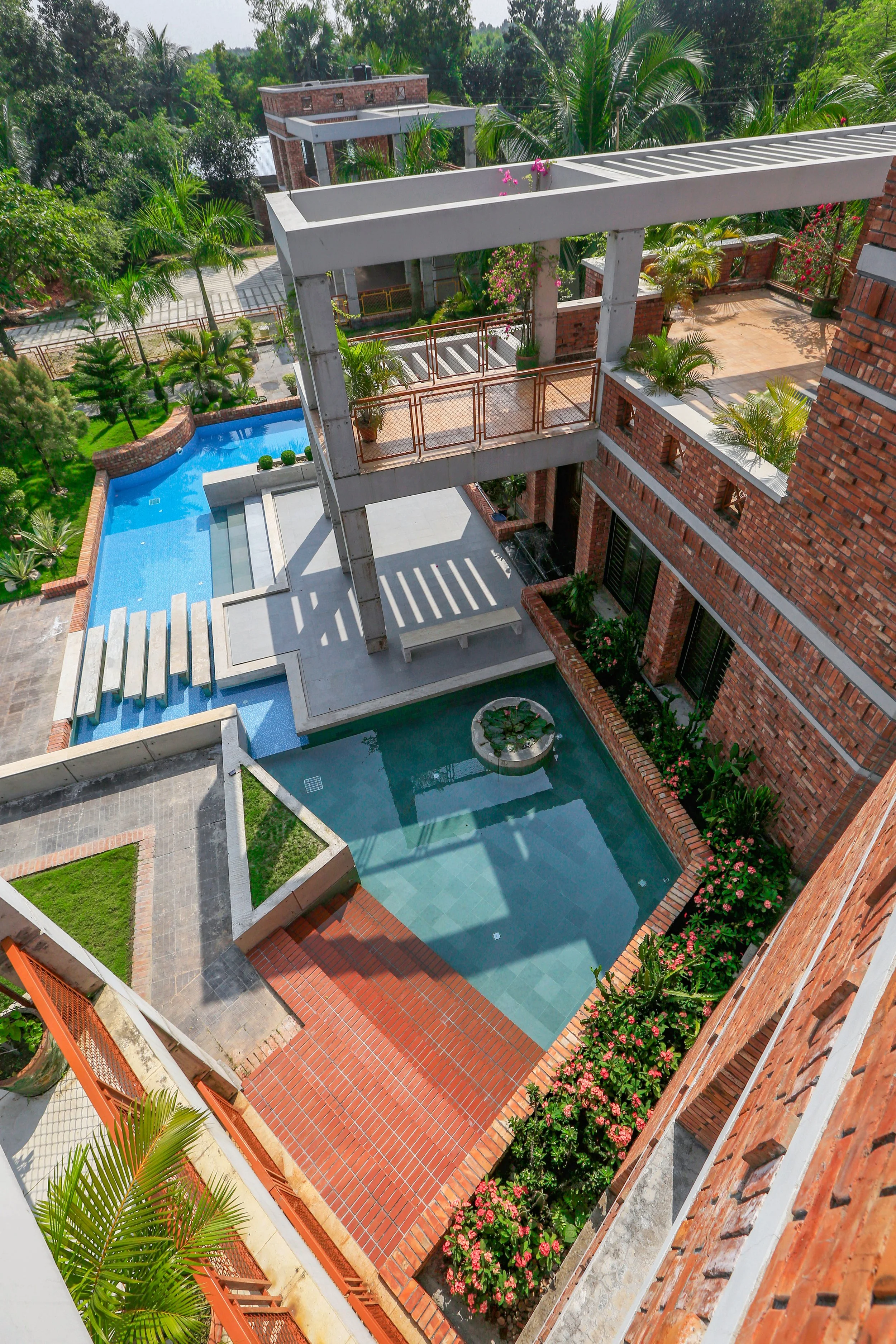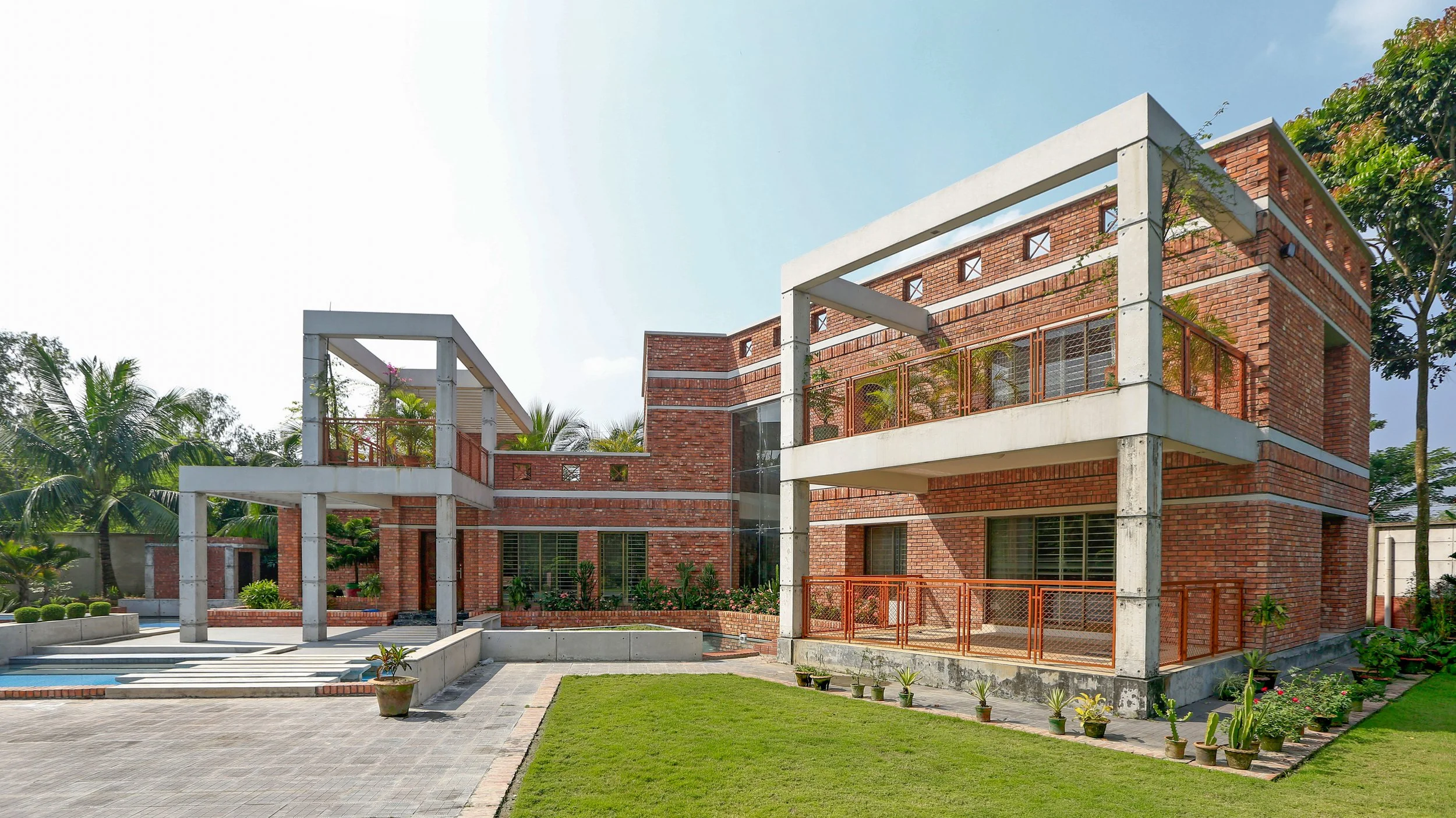 A humble brick and concrete structure is placed surrounded with a reflecting pool and landscape. The form is angled in response to the shape of the site. It’s frame extends the angular form into the landscape.